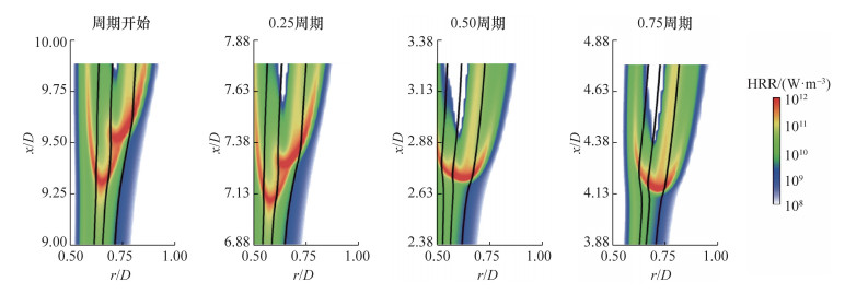 升举火焰的结构可能因为多段的燃烧放热而改变。Deng等[50]使用二甲醚扩散火焰在自着火热环境下的数值仿真研究了火焰结构对流速振荡的响应。如图 11所示,由于二甲醚燃烧的多段放热特性,升举火焰根部可以是多分叉的结构。二甲醚在常温环境的微重力射流火焰实验[51]目前并未揭示这些额外的火焰分支,而与Won等[48]和Lock等[49]的实验结果类似,微重力条件下并未出现火焰振荡。基于以上,就Buckmaster和Zhang[47]基于边界火焰理论分析提出的近极限大Lewis数的边界火焰振荡来说,目前尚未有微重力升举火焰实验观察到类似现象。