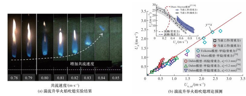在此基础上,Wang等[60]研究了常重力和微重力下伴流非预混湍流射流火焰的吹熄行为。微重力下的吹熄速度明显大于常重力下的吹熄速度。利用层流同流速度的相似性解、湍流射流中心速度解以及等效浮力速度建立理论模型来预测伴流速度与重力对吹熄极限的影响。这个基于Damköhler数的物理模型能表征不同重力条件下吹熄极限的差异,模型的预测能力优于Dahm和Mayman[56]及Feikema等[57]提出的模型。