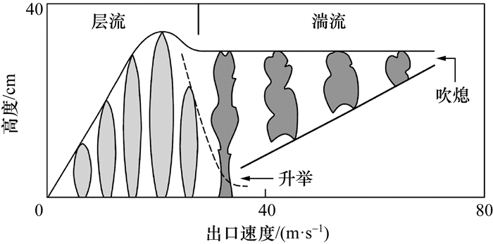 Lee等[64]在常重力条件下使用氮气作为燃料流中的稀释剂,通过实验研究了燃料稀释对非预混射流火焰升举特性的影响。根据喷嘴直径和稀释程度的不同,升举行为可分为3种不同的模式:1) 升举和吹熄都发生在层流状态下;2) 升举发生在层流状态下,而吹熄发生在流体过渡到湍流状态之后;3) 升举和吹熄都发生在湍流状态下。对于过渡情况(即模式2),火焰在层流状态下被升举,并且升举高度迅速增加,直到高度与射流的破碎长度相当。此时,升举高度和破裂长度都随着射流速度的提高而缓慢减小。随着射流速度进一步增加,接近过渡到湍流的临界Re,升举高度突然降低。在此转变之后,升举高度随喷流速度线性增加。该实验的不同火焰升举模式如图 15所示。