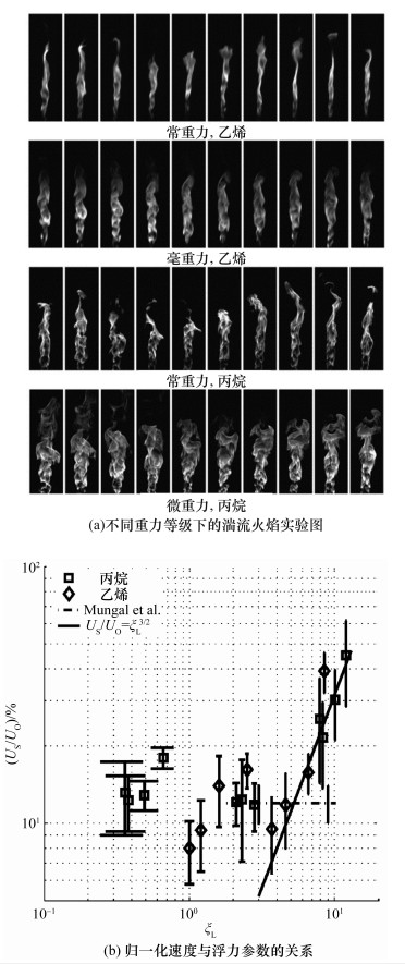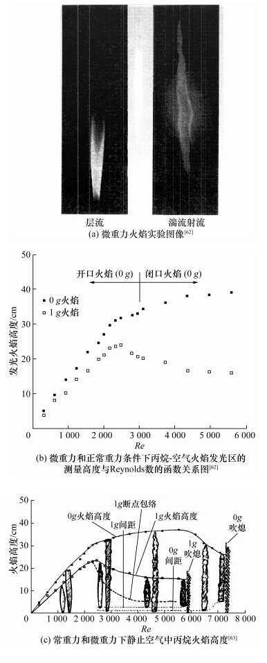 | 图 14 微重力下的层流和湍流射流火焰以及其火焰高度与常重力火焰的对比 |