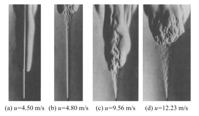 流体是否进入湍流状态能大幅度改变火焰的行为,如图 13所示[61]。流体的状态同时决定了升举稳定和吹熄的理论模型中的径向输运机理,而射流从层流向湍流转捩的过程较为复杂,原因也较为多样,对于火焰的稳定机理具有非常大的影响。下节就此方向的研究展开讨论。