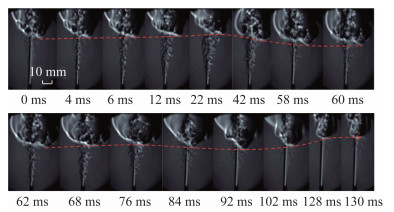 Li等[65]在常重力状态下研究了转捩性弱湍流升举射流扩散火焰的稳定特性,发现升举火焰转捩主要是由湍流射流与火焰基底相互作用引起的。随着流体发生间歇性转捩,火焰升举高度随着流体的转捩上下波动,如图 16所示。