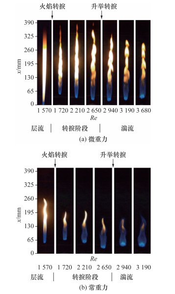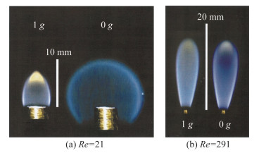 Hegde Nyma等[62]研究了常重力和微重力条件下丙烷射流扩散火焰向湍流过渡情况。微重力实验的火焰根部出现的大规模的间歇性对流结构,并在高Re数的实验中被认为是形成过通气的闭口火焰结构的原因。随着Re数的增加,微重力火焰高度逐步接近一个定值。常重力火焰由于浮力加速度引起的有效扩散系数增加,进一步增加了局部Re数,在接近Re=5 800时发生吹熄,而微重力火焰在Re=7 300左右才被吹熄 [63],如图 14所示。