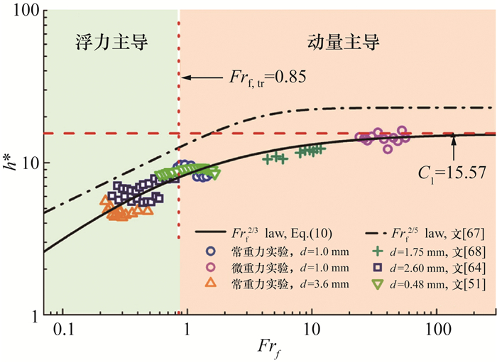 相较于Delichatsio[67]的2/5幂律模型,此模型在转捩和湍流区与射流火焰高度实验数据吻合更好,如图 18所示。