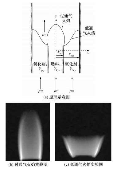 1928年,Burke和Schumann[21]首次针对轴对称和平面二维坐标系提出了扩散火焰结构的分析方法。通过假设无限快的化学反应,即空间中具有极薄的火焰面,能够将主导方程简化为扩散和对流主导的冻流(frozen flow)方程,其中假设只有与射流方向垂直的方向存在扩散,且热扩散和质量扩散速度均等(Le=1),模型中不考虑重力影响。以轴对称的同流火焰为例,不同的同流管氧化剂流量能够形成“过通气(overventilated)”和“低通气(underventilated)” 2种火焰面形貌。Law[22]总结的Burke-Schumann火焰示意图和2种典型火焰如图 2所示。