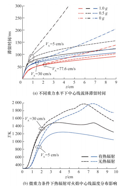 如表 3所示,在同样的工况条件下,常重力的烟点火焰高度可以是微重力的数倍,而滞留时间比微重力能小一个量级。
