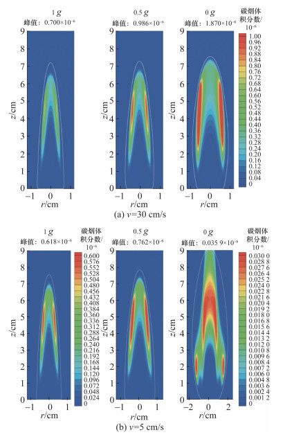 数值仿真加入辐射模型将使预测温度大幅降低,尤其是对低流速(v=5 cm/s)的火焰,预测火焰温度差异能达到800 K左右。一般来说微重力条件下的流体滞留时间较长,能较常重力生成更多的碳烟,而极低流速工况则会抑制碳烟生成,如图 21所示。