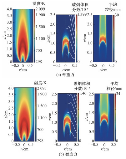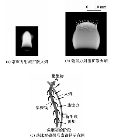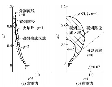 Walsh等[96]在常重力和NASA KC-1335抛物线飞机的甲烷共流层流扩散火焰实验中,通过激光诱导白炽灯(laser induced incandesence, LII)信号方式测量了碳烟的相对体积分数,实验结果表明,烟尘浓度和分布对存在的“重力抖动”极为敏感,在没有重力的情况下,碳烟峰值体积分数可以增加多达15倍。Jeon和Choi[97]采用滑轮组和配重改变重力水平,对高温空气燃烧技术(high-temperature air combustion technology,HiCOT)系统进行了0.3 g、0.5 g和0.7 g的部分重力射流火焰实验。尽管火焰温度恒定,但随着空气温度的升高,火焰中的碳烟体积分数增加。由此推断,由于火焰与空气的温差,在火焰周围产生的浮力流动能够影响火焰中碳烟的形成和氧化。