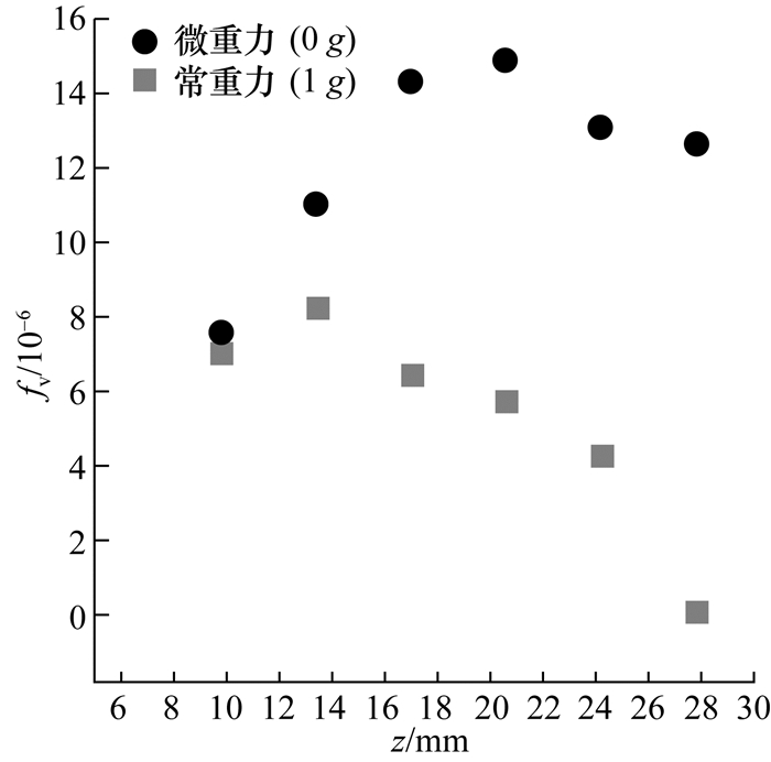 微重力射流火焰中的碳烟体积分数(soot volume fraction, fv)是实验结果和数值仿真的比较重点。Megaridis等[94]通过NASA路易斯研究中心2.2落塔研究了微重力层流射流非预混火焰在烟点以上运行时的烟场结构。在相同流速下,在微重力下测得的最大碳烟体积分数几乎是常重力下的两倍,如图 24所示。Greenberg和Ku[95]利用NASA Glenn 2.2 s落塔进行射流火焰从常重力到微重力的转变实验,碳烟体积分数峰值在微重力条件下增加了2~4倍。