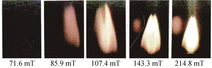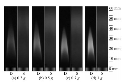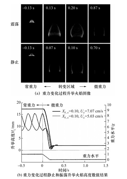 Won等[48]通过实验研究了高稀释丙烷在常重力和微重力条件下的伴流扩散火焰振荡特性。为测试浮力驱动的不稳定性机制,通过从常重力进入微重力的实验观察振荡升举火焰的特性。此研究观察到了微重力条件下火焰升举高度大幅降低,且附着于喷嘴而振荡消失的现象,证实了浮力驱动升举火焰不稳定性机制,如图 9所示。