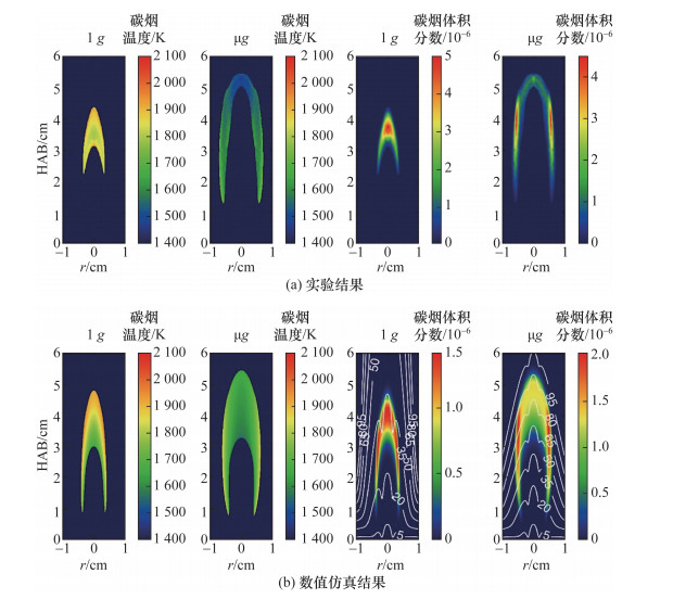 SLICE项目为ISS的CIR装置培育了ACME装置计划中的同流层流扩散火焰(coflow laminar diffusion flame,CLD Flame)项目。Dobbins等[105]对常重力(Yale同流燃烧器)和微重力条件(ACME-CLD Flame)下的乙烯层流同流扩散火焰进行了实验和数值仿真研究。在微重力条件下,火焰更长且宽,火焰温度更低,碳烟水平和气体停留时间增加。数值仿真中的碳烟模型考虑了热泳、扩散、碳烟起始(inception)、表面成长、氧化和老化近似模型。辐射模型使用了Monte Carlo光追踪法耦合谱线数据库,包含了吸收、发射和非灰体散射等模型。然而,研究结果表明,该模型仍可能无法准确预测温度场,而将实验测得温度用于求解可以提供更准确的碳烟场,如图 28所示。