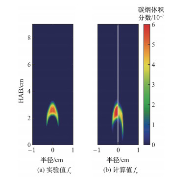 碳烟在扩散火焰中的具体分布情况与燃料稀释比和压力相关[106],Veshkini和Dworkin[107]的数值仿真揭示了由于微重力条件下较长的滞留时间,使HACA(hydrogen abstraction carbon addition)的碳烟表面生长以及多环芳烃(polycyclic aromatic hydrocarbons,PAH)的生长具有更充分的时间,尤其促进了扩散火焰在两翼处的高碳烟体积分数,而火焰中心线的碳烟分布对于重力较不敏感。Kempema等[108]研究了使用Yale Coflow燃烧器燃烧40%乙烯空气火焰实验的二维温度曲线来约束共流层流扩散碳烟火焰的详细数值解,因为此方法不求解能量方程和辐射输运方程,能够直接避免辐射模型预测不准确对碳烟分布预测的影响。结果显示,在无约束情况下,碳烟起始是主要的凝聚相形成机制,因此碳烟体积分数的峰值位置从沿火焰翼迁移到中心线,而受实验温度约束的碳烟分布相对准确很多,如图 29所示。此研究说明了扩散火焰中的碳烟分布预测与辐射模型的准确性高度相关。