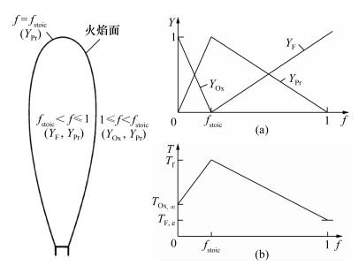 Burke-Schumann火焰的结构具有解析解,主要可分为2部分描述:1) 当量比为1的曲线被视为扩散火焰面,具有特定的空间分布;2) 由当量比为1的位置向内和向外经过一定的坐标变换得到线性的温度和浓度分布。Turns的燃烧学教科书[23]描述的Burke-Schumann火焰结构如图 3所示。Burke-Schumann理论火焰结构中流速与火焰高度的相关性是微重力射流火焰研究的重要出发点之一。