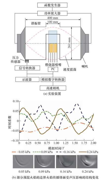 火焰和声场的交互作用常见于能源动力系统中燃烧室热声振荡。许多实际应用中的重要故障模式,都是由于热声振荡无法抑制的过度发展造成的,火焰释放的热量或流体产生的压力波振幅产生叠加能会对燃烧室产生直接的力学破坏。由于燃烧的热声振荡现象和压力波与环境包络面所产生的共振相关,许多宏观的热声振荡研究使用火焰响应函数和反馈模型对热声振荡的频率和振幅发展进行研究[109-110],而许多实验或数值仿真分析直接针对具体燃烧室规模开展[111],一些基础研究使用Rijke管分析特定尺寸共振腔燃烧中的热声耦合现象和热声振荡的Rayleigh稳定条件[112]。由于微重力实验对于装置体积和安全性要求较高,微重力条件下的宏观燃烧与燃烧腔体的热声振荡实验较难进行。一些研究者基于火灾场景的应用进行声场影响火焰稳定性的实验,为声致灭火提供重要依据[113-115]。