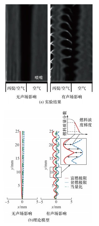 Xiong等[115]指出,火焰脉动位移主要是由扬声器膜(或振膜)运动引起的气流,该气流比纯声波(纵压振荡)引起的空气分子位移大100倍左右。因此,声场灭火不是由声波引起的,而是由扬声器(声源)引起的脉动风引起的。Sugui等[116]利用狭缝燃烧器形成部分预混火焰并在火焰两侧施加声场,观察了声压对火焰传播前锋(图 30)以及火焰分支结构(图 31)的影响。