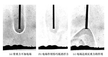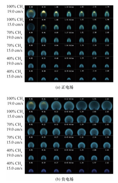 由于火焰是弱等离子体,火焰中带电的组分(H3O+, C3H3+, CH3+, CHO+, O2-, OH-, O-, CHO2-, CHO3-, CO3-)[117-119]和电子在空间中的分布可受电场影响,造成了宏观火焰形貌和结构受其控制的现象。此类现象容易在没有浮力对流的环境下体现出来,因此这是适合在微重力条件下研究的燃烧现象。Dunn-Rankin团队[120-122]研究了利用电场在常重力环境下模拟微重力射流火焰的方法,火焰形貌如图 32所示。初期的实验通过毛细管提供燃料,2012年之后的实验使用气体燃料并在燃烧器和下游远场形成电场,如图 33所示。事实上,笔者认为电场与带电燃烧产物交互作用所产生的体积力与浮力所产生的体积力并不能完全等价,即便是常重力火焰在电场中的形貌近似微重力火焰也不能完全视为模拟微重力环境的手段。