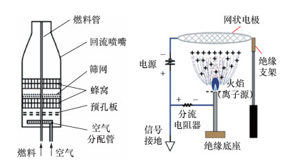 Karnani等[122]利用NASA的2.2s落塔研究了电场对微重力火焰的影响。对于所研究的火焰条件,1 kV/cm范围内的电场可以模拟1 g环境下浮力的影响。根据燃料平均喷射速度,来自同流的强制对流也可以产生类似的对流效果。弱电场对射流火焰的影响在1 g下被浮力对流所掩盖。离子电流的瞬态测量表明碳烟颗粒的存在降低测量的离子电流。碳烟辐射通过淬火反应区来降低火焰温度,这会对离子产生巨大影响,而碳烟的产生及其随后的氧化将动力学途径转向非电离的组分,这也可能减少离子的产生和降低测量的离子电流。