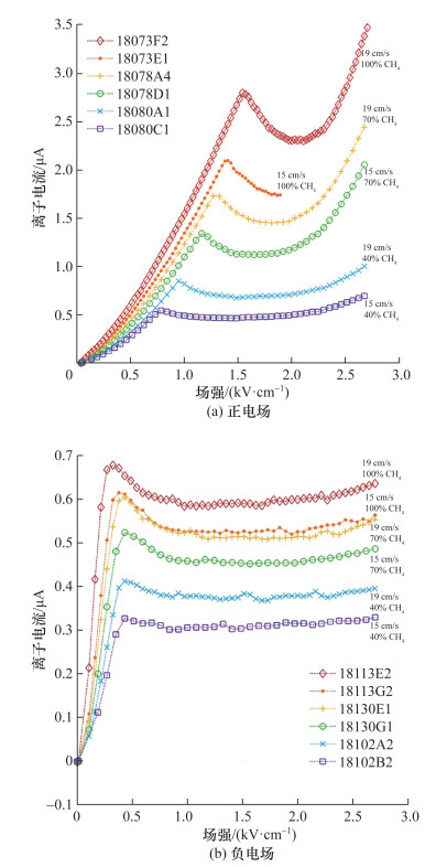甲烷/空气同流火焰的形貌可以通过无碳烟火焰图像的自然化学发光进行观察。实验结果表明,在负电场中,当火焰处于最短的高度(即向下驱动的风最强)时,就会出现峰值离子电流。在正电场中,火焰显示为常重力状态下的烛状,显示出类似于重力驱动的浮力流的向上离子驱动风。此外,对于正场,离子电流峰值随着碳流入而线性增加,如图 35所示。由于火焰形状和离子电流是相关的,因此难以量化饱和离子电流与火焰动力学的关联。在离子电流达到饱和时,火焰产生每个碳原子流入的可预测离子电流水平,这表明所有火焰都具有一致的化学动力学,导致每个碳原子的正离子饱和产生之间存在一致的关系作为燃料稀释的函数。