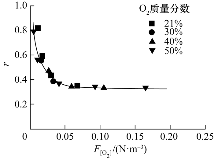 在射流火焰问题中,火焰的高度可视为燃料在特征时间内被消耗的高度,而火焰的宽度为燃料自射流出口向外扩散的速度,由于动量的特征射流时间tjet~d02/D,而浮力的特征射流时间tjet~(U0d02/gD)1/2[19](其中d0为流体出口直径,D为扩散系数,U0为出口流速),浮力效应对火焰的影响将消失在U0>gd02/D的条件下,形成动量主导的火焰问题。对于没有同流的射流火焰来说,由于边界层影响,射流速度将随着轴向长度而下降,火焰高度Lf和射流出口直径的比值与Re和Sc数(Sc=ν/D)呈如下关系[27]: