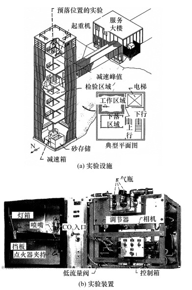 Cochran等[24]自1971年起通过NASA的Lewis研究中心2.2 s微重力落塔开始研究层流气体射流扩散火焰在微重力环境下的燃烧情况。由于落塔实验需要搭建绝对封闭的实验设施,一般包括了用于隔绝外部流动的燃烧室、流量控制器、气瓶、减压阀、电磁阀、控制系统、相机等,这些装置在落舱内形成系统闭环,可在自由落体过程中进行实验,如图 4所示。这样的通用实验装置设置至今仍具有参考价值。