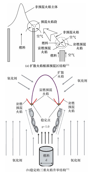 3 微重力射流火焰的升举和稳定机理研究由于射流喷射出的扩散火焰中燃料在环境气或伴流氧气中会在燃烧器壁面附近形成“预混段(premixed segment)”,因此火焰根部能稳定在燃烧器喷嘴出口附近。此时扩散火焰的根部具有预混火焰的传播特性,并具有典型的三叉(tri-brachial/triple)火焰结构,包括富燃预混火焰、扩散火焰、贫燃预混火焰3个分支,如图 6a所示[22]。当燃料流速增加时,流体的剪切作用使得更大的空间范围内出现燃料和氧化剂的预混,扩散火焰的三叉火焰结构能够向下游移动直到预混火焰的层流火焰速度与当地的流体速度匹配。此现象被称为扩散火焰的“升举”,如图 6b所示[33]。