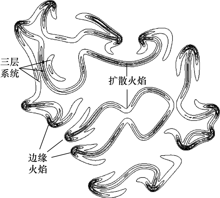 事实上,层流扩散火焰的升举更广泛地被认为与湍流扩散火焰中的微结构相关[34],边界三叉火焰在湍流扩散火焰中传播的情况如图 7所示。