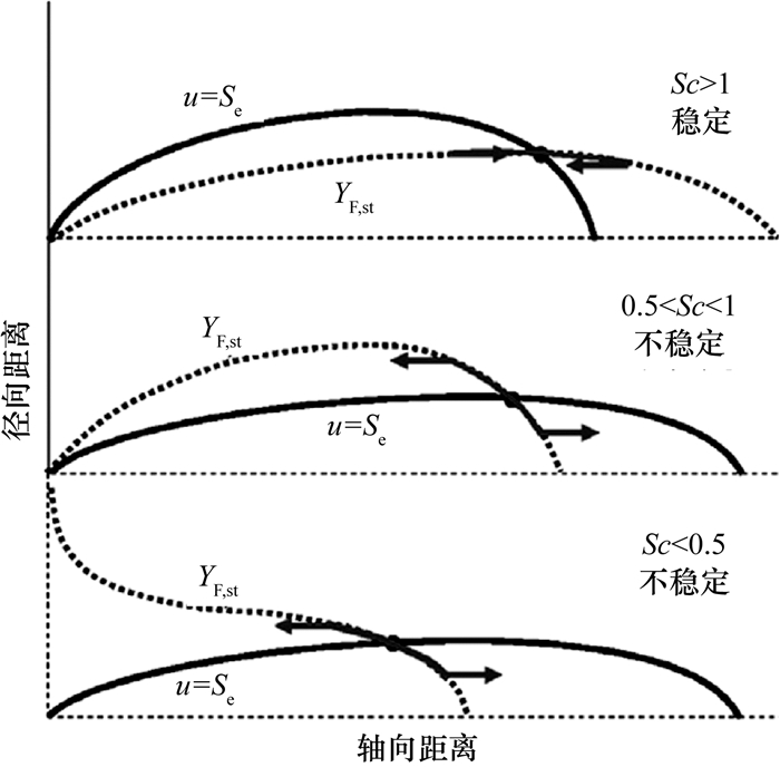 已有学者对常重力下层流非预混射流中的升举火焰进行了广泛研究[35-39], 其中围绕火焰的升举[40-41]、火焰根部的三叉火焰[42](又称边界火焰[43]或部分预混火焰[44])特性等也有综述进行了介绍。Chung和Lee[35]在1991年发现了某些氢气火焰无法通过增加燃料流量达到升举状态,而是越过了升举状态直接发生吹熄。Lee和Chung[36]的研究和分析表明,Sc数对火焰稳定升举起决定性作用。只有Sc大于1才能实现稳定的火焰升举,如图 8所示。