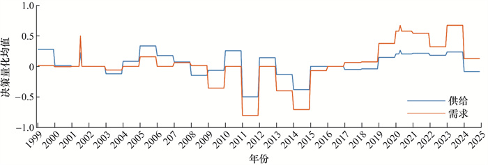 在表 1所示的供应决策权重量化结果中,5位专家对后3项因素的评价结果差异较小,而专家3认为金融投资采购的影响最大,与其他专家的评价结果有明显差异。表 2所示的需求决策权重量化结果中,5位专家的评价结果基本一致,均认为核电发展对需求决策的影响最大。进一步分析权重差异对量化结果的影响,参考式(6)对1994—2004年的数据进行处理,得到5位专家的供应和需求决策序列,以其中任一专家评价结果为参考,计算其他专家评价结果的相关系数,并取均值分析:对于供应决策,核电发展、金融投资采购、在运矿山生产成本、新建矿山开发进度和全球勘探投入的相关系数均值分别为0.667、0.635、0.562、0.548和0.519;对于需求决策,核电发展、金融投资采购、分离功价格和全球库存储备的相关系数均值分别为0.860、0.861、0.855、0.776和0.819。可见,取均值时决策结果具有良好的一致性,可以消除评价中的部分干扰。最终决策的量化均值结果见图 3。
